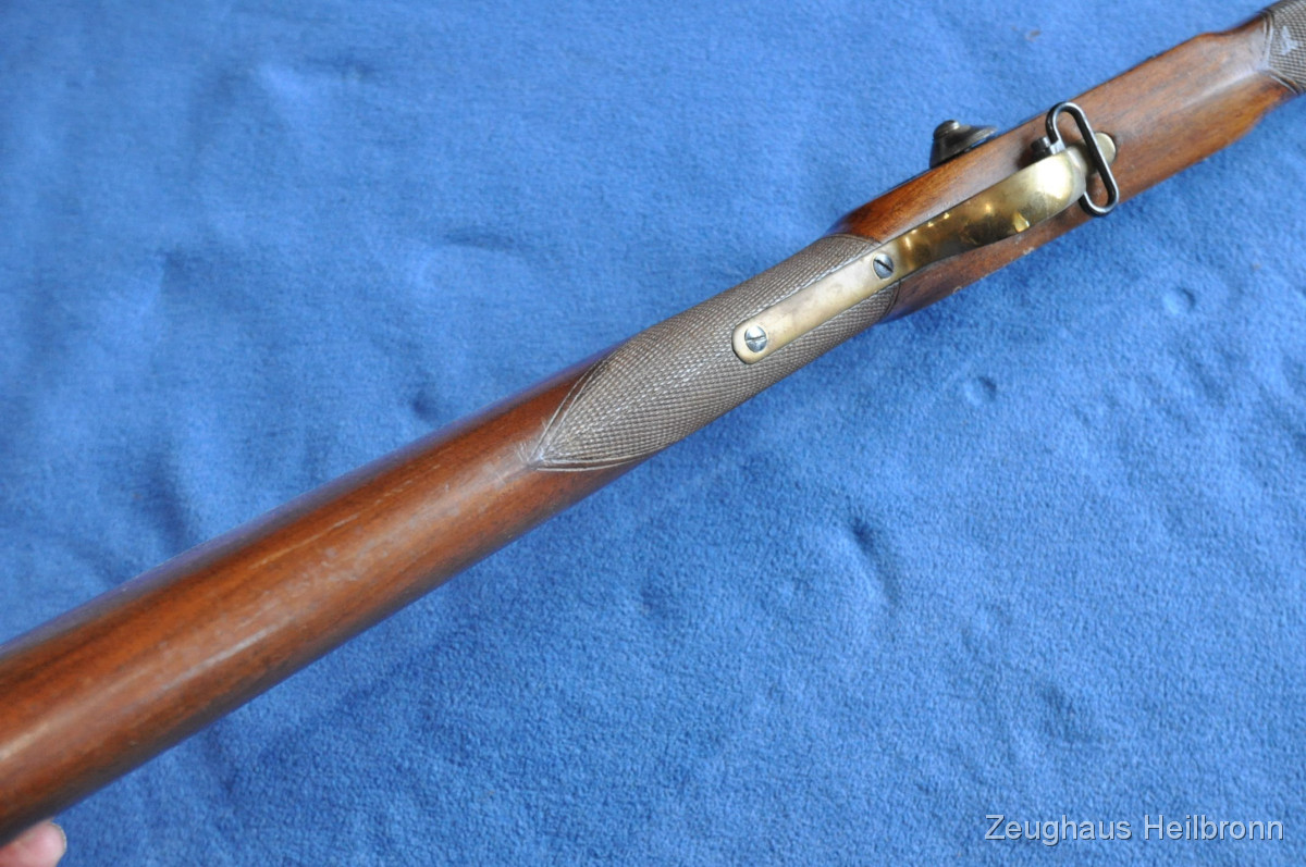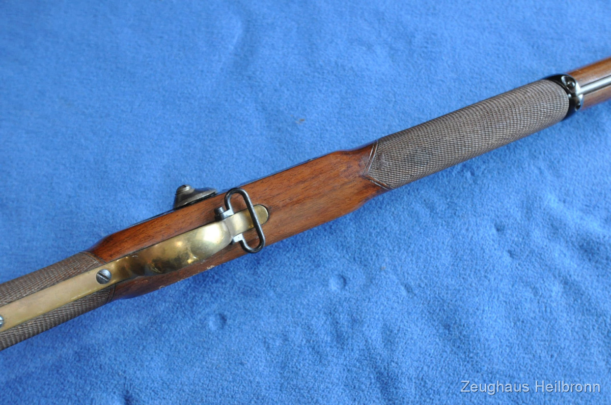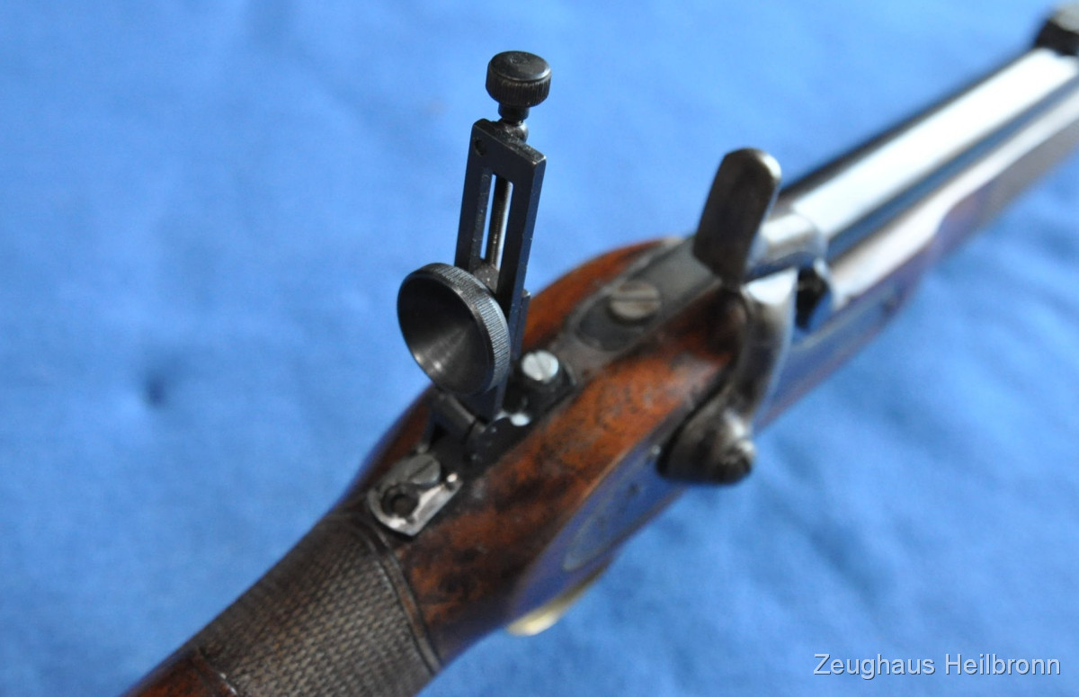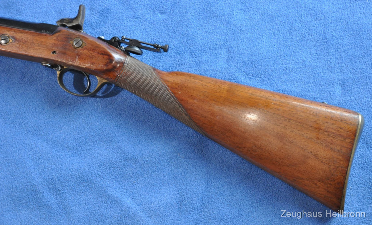 Waffe in einem schönen Zustand mit leichten Gebrauchsspuren am Schaft, Brünierung sehr gut, siehe Bilder, mechanisch voller Funktion, Lauf sehr gut. Mit Diopter. Hochwertige Fertigung aus England.
