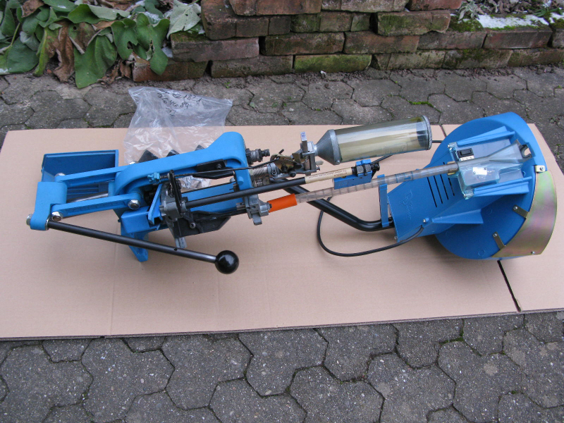 Weiterhin dabei ist eine Hülsenhalteplatte Nr. 1 (Müsste für 8x57 und 45ACP passen, ohne Gewähr! Gerne selber googeln) und die zugehörigen Abstandsstifte, die die Hülsen am Rausfallen hindern, ich denke, daß der Vorbesitzer mit der Presse auch 8x57 geladen hat oder es tun wollte, denn es liegt ein Matrizensatz in 8x57IS von RCBS bei, ebenso diverse Umbauteile für die Hülsenzufuhr. Weiterhin der Zündhütchenzuführteller für Large ZH, das Magazinrohr für selbige sowie Pickrohre für beide Größen. Natürlich auch die Anleitung in Deutsch und Englisch und diverse Verschleißteile. Eine Zweite Kopfplatte mit Ständer, ein zweiter Pulverfüller. Es liegen zwei zusätzliche Pulverschieber bei, so daß für jeden Füller je ein kleiner und ein großer Schieber zur Verfügung steht. Der Zündhütchenwarn-Piepser hatte ein gebrochenes Gehäuse, welches ich geklebt habe, nun wird es mittels Kabelbinder statt Schraube am Magazinrohr befestigt. Wenn es läuft, ist man mit der Presse richtig schnell, die Pulverdosierung ist sehr genau und sehr sicher. Beim Hülsenmaterial und den Zündhütchen ist sie etwas pingelig. Wenn die Zündhütchen sehr schwer in die Zündglocke gehen, werden sie leicht mal zerdrückt. Vielleicht lässt sich hier mit Feineinstellung noch etwas erreichen, aber am wichtigsten sind gute Hülsen. Von TopShot muss ich hier abraten, Leader liefen sehr gut, Magtech soll auch gut sein. Vielleicht mag die Presse auch die sehr weichen Federal Zündhütchen nicht. Wird aber an diesem Stück nicht anders sein als an jeder anderen XL650.