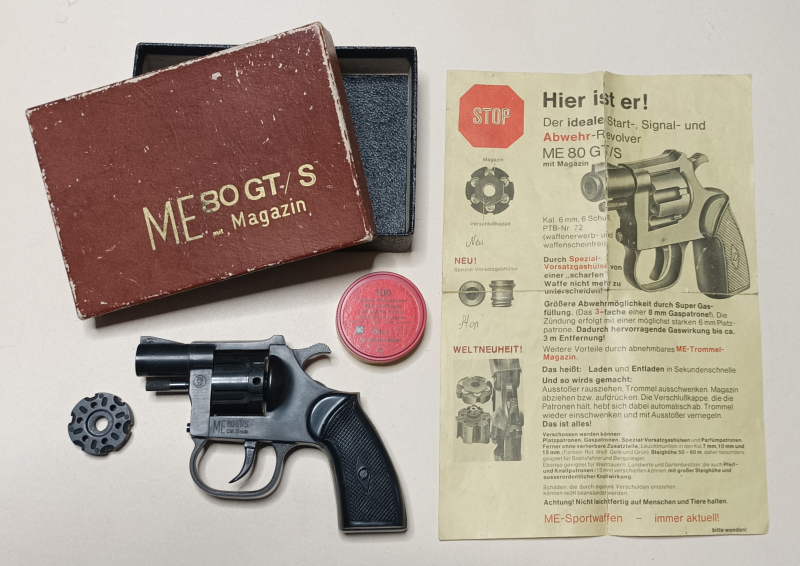 Sie bieten hier auf den abgebildeten Signal- , Platzpatronenrevolver ME 80 GT/S , PTB-Nr. 72 in hervorragendem Zustand, mit orig. Schachtel , einem zusätzlichem 6 Schussmagazin , orig. Bedienungsanleitung bzw. Beschreibung und ca. 80 Stk. Flobert Platzpatronen 6 mm Marke Dynamit Nobel.Wir haben ihn beim Räumen der Wohnung unseres Onkels im Schrank gefunden und wir können damit nichts anfangen. Vielleicht findet der Revolver auf diesem Weg bei einem Sammler oder Waffenfreund ein neues Zuhause. Das würde uns sehr freuen . Viel Spass beim Bieten.