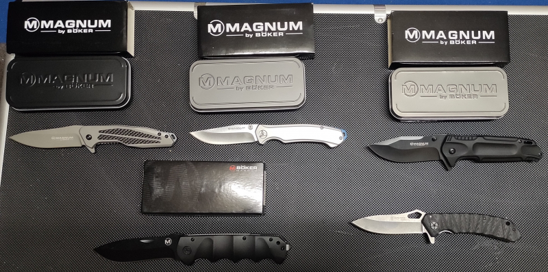 Vier Böker Magnum Messer sowie ein Elite Force Messer. Alle aus einer Sammlung und unbenutzt. Alle Messer ausser das Elite Force werden komplett in OVP mit Folie, Papieren und im Falle des Blue Steel mit Torxschlüssel geliefert.