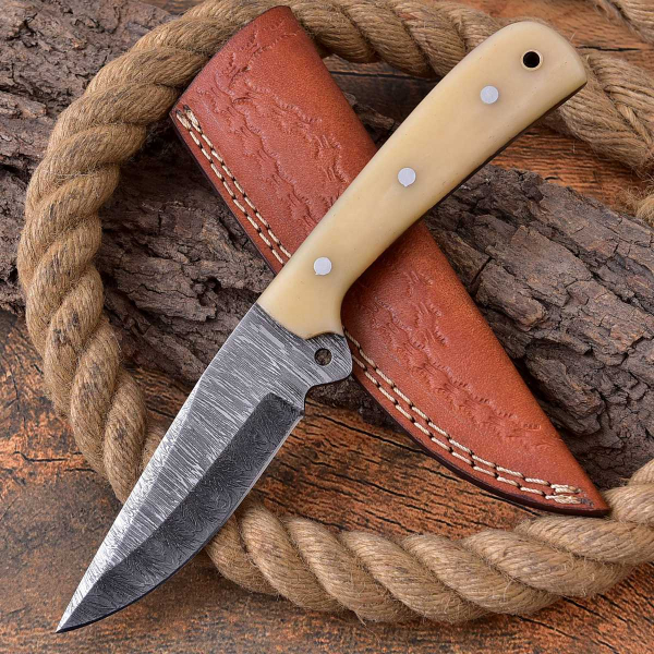 Damast Jagdmesser schöne Klingenmaserung Damast Stahl mit Lederhülle MAQ6132
