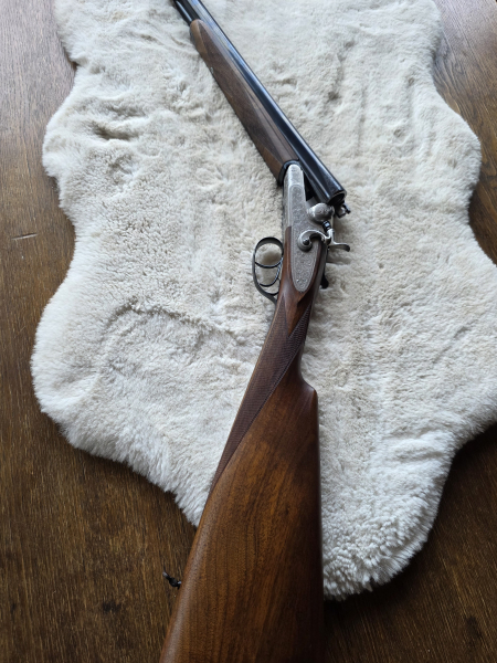 Hahndoppelflinte MARIO BESCHI GARDONE Italy, Mod. Ambassador, Kal. 12/70, hochwertige Hahndoppelflinte mit echten Seitenschlossen, massive doppelte Keilverriegelung, Purdey Verriegelung, Nußbaumschaft englische Schäftung mit fein geschnittener Fischhaut, das Schaftende wurde ebenfalls mit fein geschnittener Fischhaut ausgebildet, Metallteile und Schlosse fein graviert, Lauflänge 70,5 cm, Choke 1/2 - 1/1, Stahlschrot bis 3,25 mm möglich, Schaftlänge bis Abzug 38,5 cm, die Waffe wurde nicht jagdlich geführt (Schrankwaffe), die Waffe weist eine perfekte Verarbeitung auf.