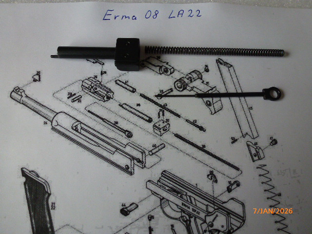 Biete hier für eine Erma 08 LA22 in .22lfB einen Ausstoßer, und eine Schlagbolzeneinheit mit Feder an (siehe Explosionszeichnung).