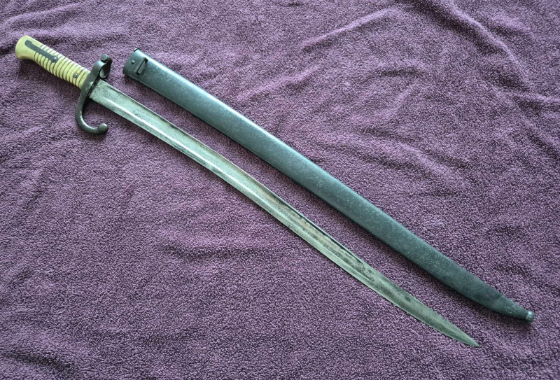 Sie bieten auf ein Beute-Bajonette Chassepot M1866 Yatagan, welches die Deutschen im Krieg 1870/71 gegen die Franzosen erbeuteten, um dann mit den passenden Chassepot Gewehr die deutsche Landwehr damit ausrüsteten. Das Stück besitzt den Truppenstempel 96.L.I.1.145 und ist damit dem 7.Thüringisches-Landwehr-Regiment- Nr.96 1. Bataillon zuzuordnen welches sich zu der Zeit in Altenburg befand, was das Stück sehr selten macht. Eine weitere Besonderheit ist der Deutsche Hersteller Weyersberg-Kirchbaum & Cie aus Solingen (Ritterhelm auf der Klinge), er fertigte nur 1867/68 und auch nur eine kleine Stückzahl für die Franzosen. Die Scheide besitzt noch die originale schwarze Farbe und die französische Waffennummer wurde wie üblich gestrichen. Bei weiteren Fragen einfach melden. Versand in restliche EU 20,00Euro.