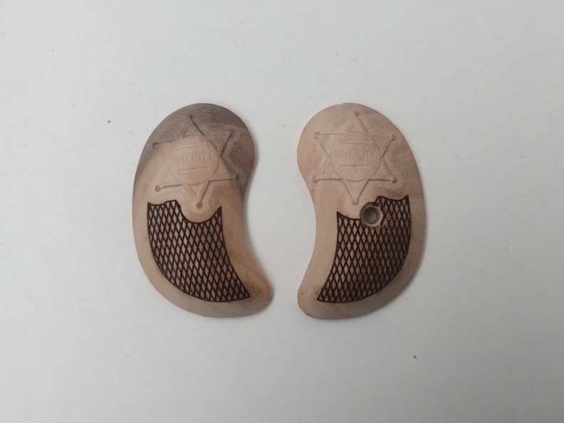 Die Griffschalen haben einen gravierten Sheriff-Stern drauf und ein klassisches Lasermuster darunter. Sie sind unversiegelt auf der Oberfläche, damit der Nutzer die Griffschalen nach seinem eigenen Wunsch färben (beizen), ölen oder wachsen kann.