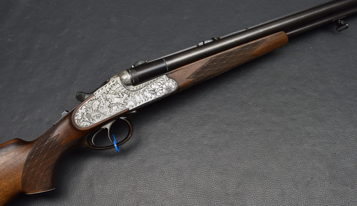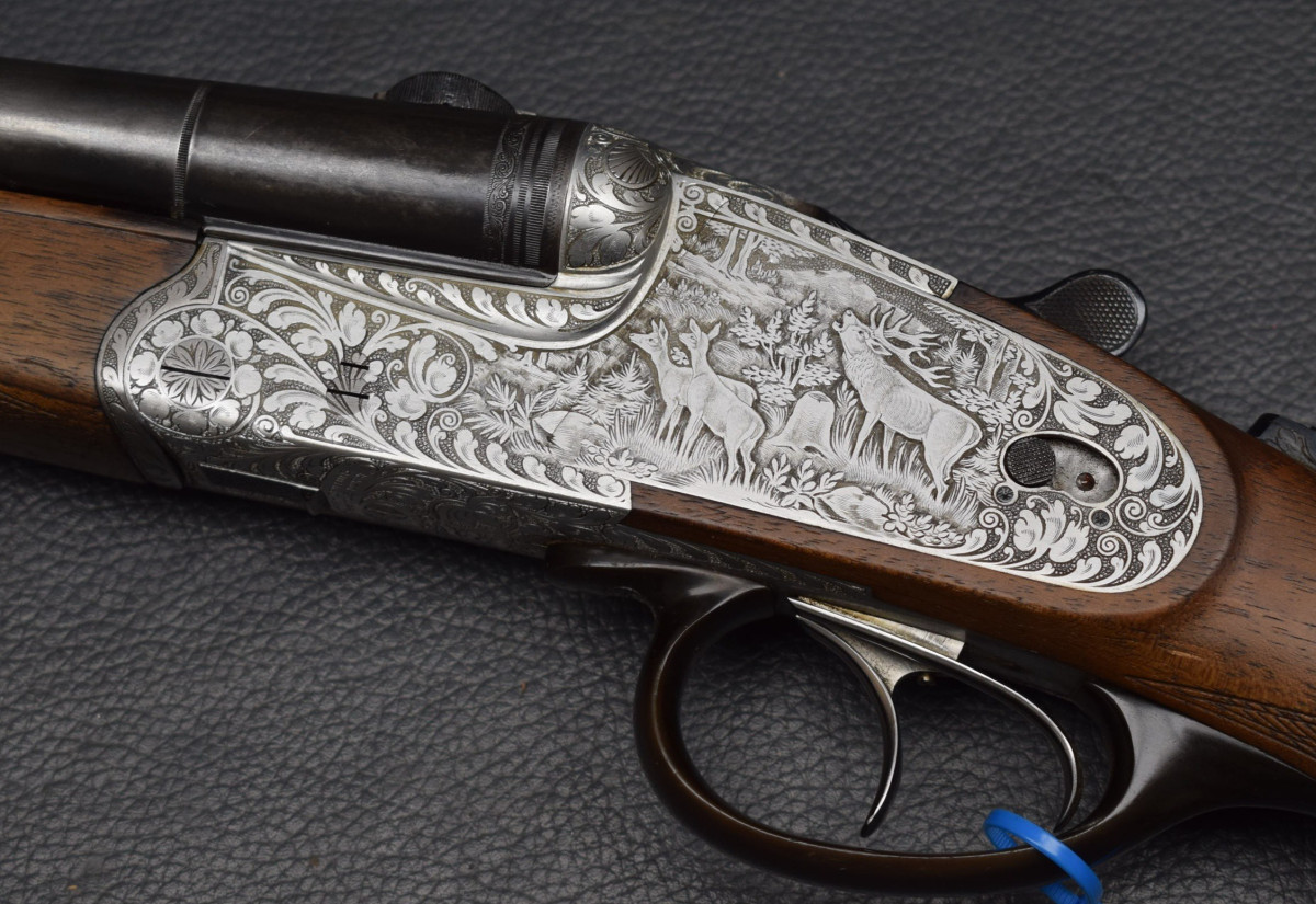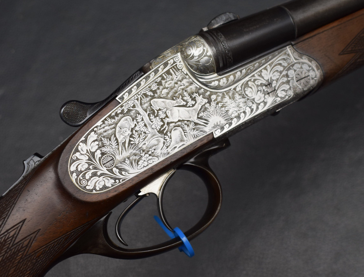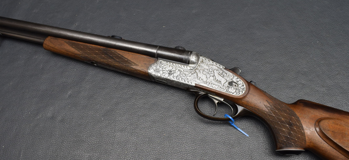 seitliche Schiebesicherung, montiert mit SEM Basen. Nußbaumschaft mit mit Deutscher Backe, Riemenbügeln und Schaftkappe