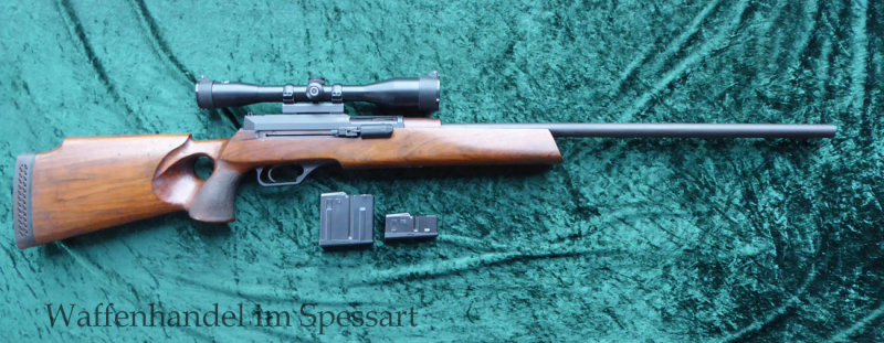 Kal..308Win., Ser.Nr. 2446. Beschuß 1994. Blanker 68cm langer Polygonlauf. Außendurchmesser 22,5mm. Sehr gute orig. Brünierung. Nußbaumlochschaft. Mit Zielfernrohr Schmidt& Bender 10x42 Absehen 4 oder 8 (Fadenkreuz) auf 1" orig. Heckler & Koch Spannmontage. Das ZF hat Staubschutzklappen von Butler & Creek. Zu diesm Gewehr gehören 1x 10 Schußmagazin und ein 2 Schußmagazin. Das Gewehr ist nur gelegentlich mal probiert worden und hat eine geringe Schußbelastung! Gesamtlänge 123cm. Lauflänge 68cm, Schaftmaß 36,5cm.