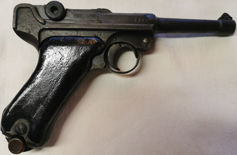 Pistole Mauser 1920 1918; Herstellung Erfurt; Kaliber 9mm Luger; Zustand siehe Bilder, Brünierung vorhanden, Rostnarben vorhanden und behandelt, Nummerngleich; Holzgriff unterhalb der Sicherung kleines Stück abgeplatzt; Zweites Magazin dabei; Sehr schöne Sammlerwaffe, schaut euch die Bilder.