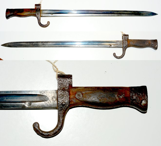 Französisches Berthier Bajonett 1892, ohne Scheide, der Griff stark rostig, die Klinge hat stellenweise leichte Rostnarben ist aber überwiegend gut