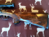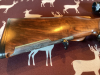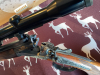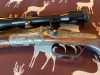 Hahnkipplaufbüchse, Kaliber 8x57IS, Hahn-Seitenschloss mit gegenüberliegender Platte, Greener Querriegel, Baujahr 1925 laut Vorbesitzer, Round Body - beste Verarbeitung, Tief gestochene plastische Jagstück-Gravuren, rechts Altier und Hirsch, linke Keiler und Bache, feine Skroll-Gravur, tief gestochene Umrandung. Besonderheit: verlängerte Scheibe Skroll-Gravur, fein gravierter Abzugsbügel mit Monogramm-Platte (noch offen). Alle Halteschrauben feine Skroll-Gravur, Öffnungshebel (Top-Opener) leichte Gravur auf dem Rücken, Laufwurzel leichte Gravur mit Goldeinlage. Feine Randgravur auf Patentschnäpper am abnehmbaren Vorderschaft, Schaftmagazin Klappdeckel mit Skroll-Gravur. Wurzelmaserholz, dreifache Falzbacke. Sehr fein geschnittene Fischhaut. Suhler Einhak-Montage mit leichter Gravur, Zielfernrohr Zeiss 6x42T. Handwerkliche Fertigung - Liebhaberstück.