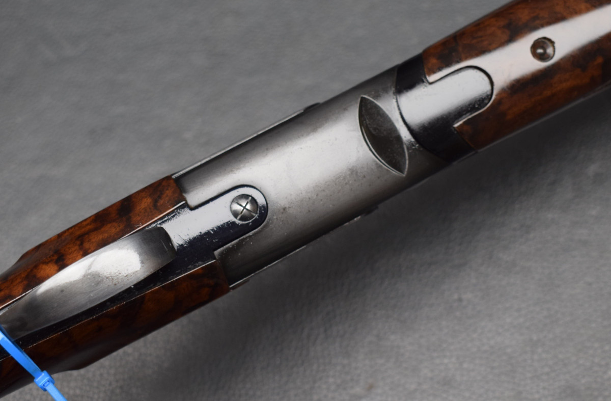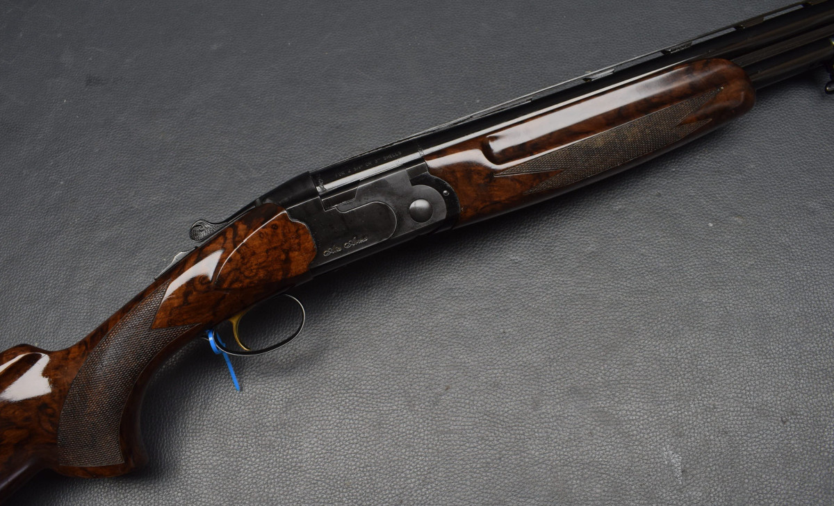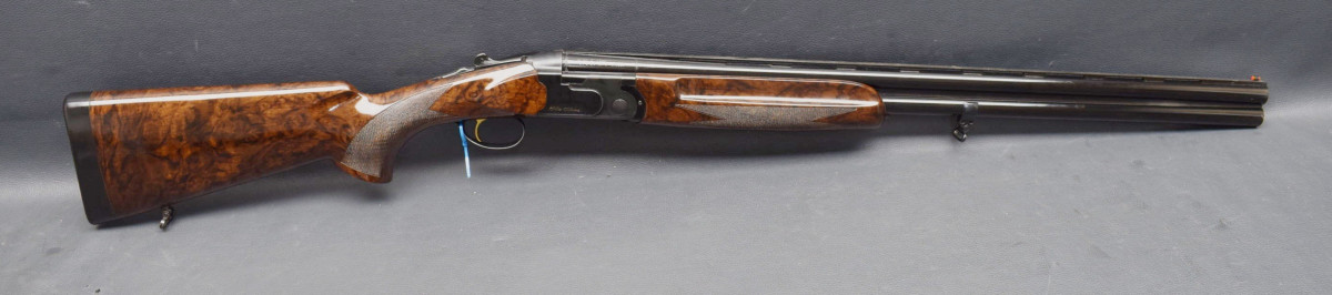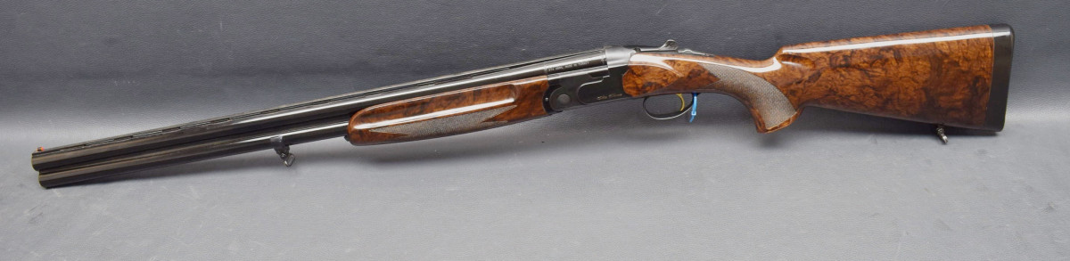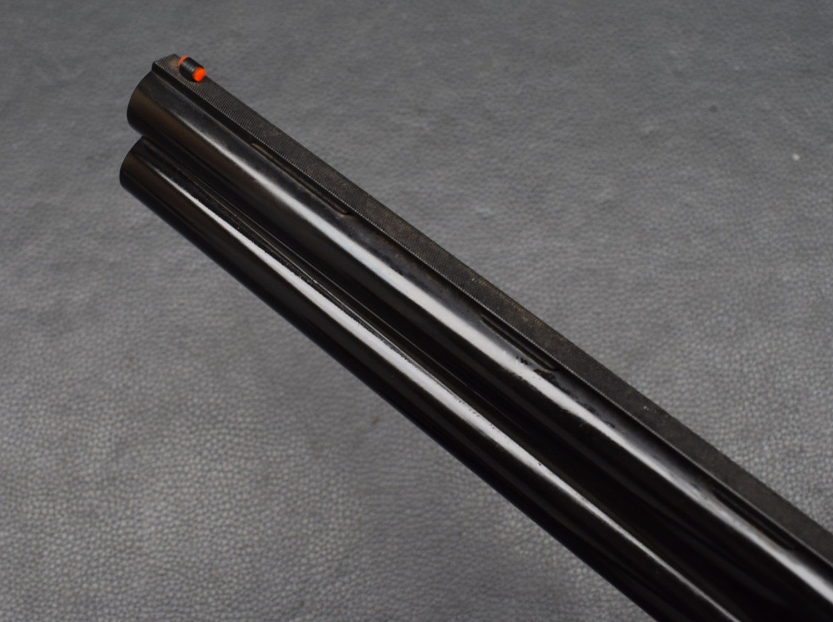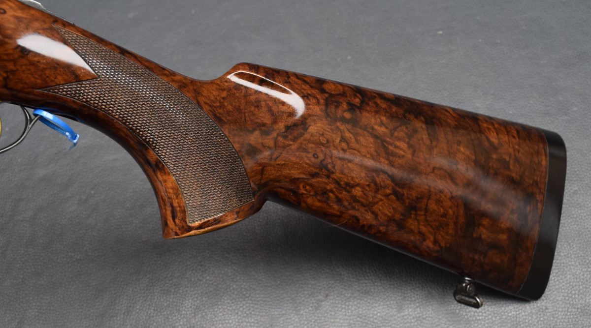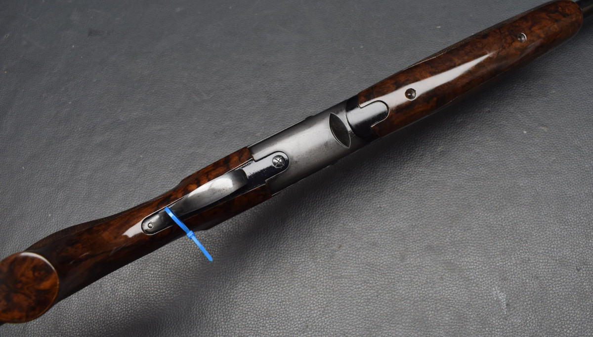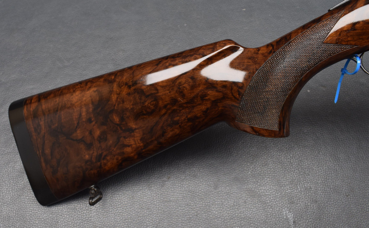 8mm breite, ventilierter Schiene, Lechtkorn, Ejektoren, brünierte Stahlbasküle, goldener Einabzug, heller, brünierter Stahlabzugsbügel, Sicherungsschieber & Umschalter auf dem Kolbenhals. Nußbaumschaft ohne Backe, Kunststoffschaftkappe 30mm dick und Riemenbügeln. Läufe sehr gut, Verschluß dicht, Brünierung 97%, sehr schöner Schaft Gebrauchtwaffe sehr gut