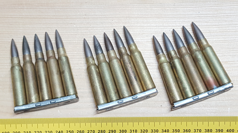 Sammlermunition: 15 Dekopatronen 7,5mm MAS a. Ladesrteifen.