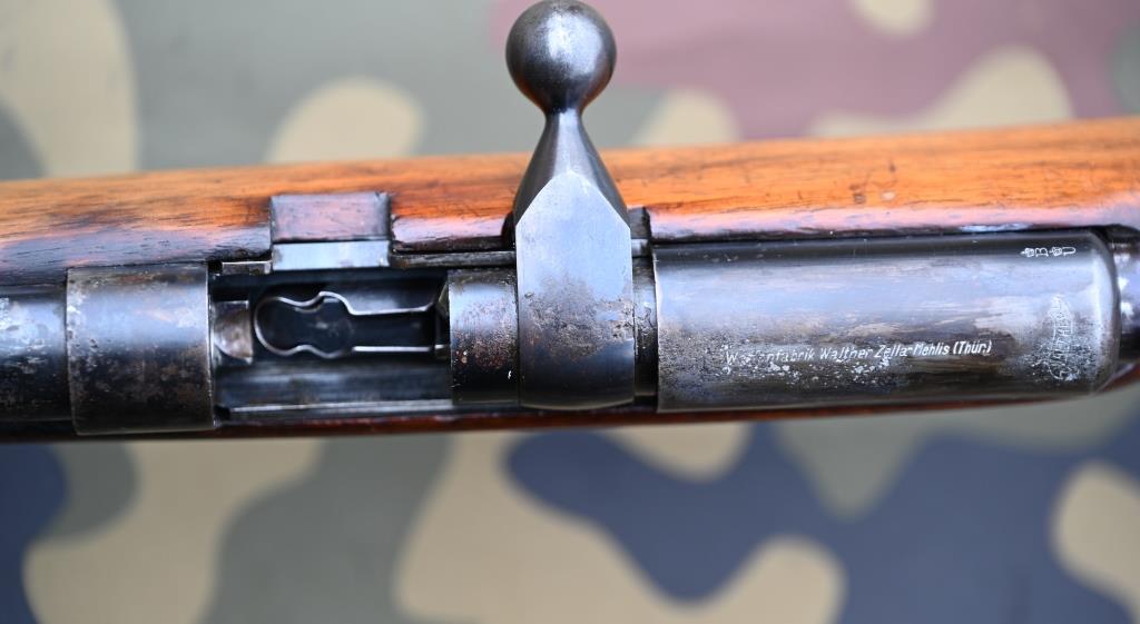 Optisch und technisch etwas "gedient" erhalten, mit harmlosen, normalen, altergemäßen Gebrauchsspuren, aber besonders auf dem Lauf oben auch viele feine Rostnarben. Magazin dagegen absolut neuwertig erhalten.