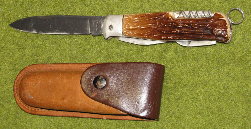 Zum Verkauf kommt ein einfaches Taschenmesser mit Hirsch und Hornimitat