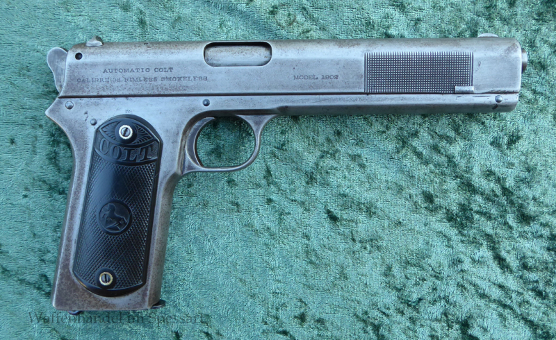 Kal..38AutoSpec. Baujahr 1906. Ser.Nr.12315. Das Laufinnere hat runde Felder und Züge. Es ist rauh. Die Brünierung ist abgegriffen und die Oberfläche hat Patina. Das Magazin ist original. Gute Mechanik und Funktion.