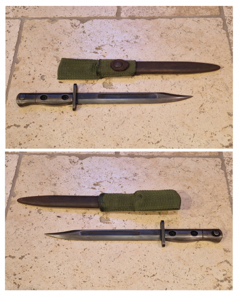 Aus Sammlungsauflösung biete ich ein nummerngleiches, sehr seltenes britisches FN FAL-Bajonett für das FN Sturmgewehr M964 (in vielen Ländern das Nato-Sturmgewehr nach dem 2. WK), Baujahr Ende der 1950er Jahre. Das Bajonett ist mehrfach signiert / gestempelt „UK A 3, 9600257, G71“, auf der Klinge nummeriert B67. Der Zustand des Bajonetts ist auf den Fotos zu sehen und mit gut bis sehr gut (8-9/10) in Anbetracht des Alters zu bewerten. Es gibt nur minimale Gebrauchsspuren in Form von leichter Alters-Patina, kein Rost o.a. Mängel und / oder Beschädigungen, alles ist gängig und nichts wackelt. Abgabe nur an Personen ab dem 18. Lebensjahr gegen Altersnachweis.