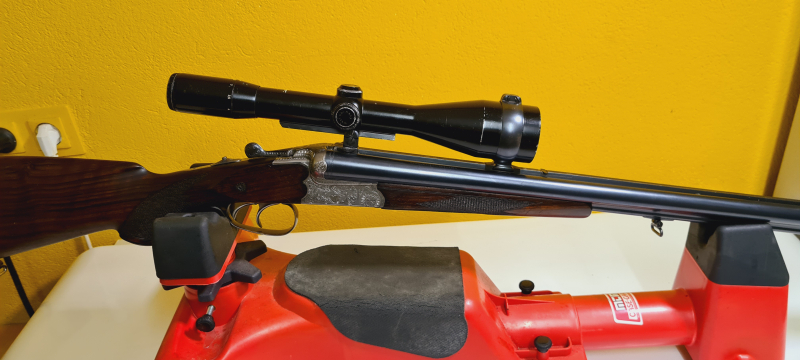 Ausstattung: Doppelschloss‑Drilling (Fortuna – Suhl), klassische Schaftform, Riemenbügel, justierbare Visierung; Einstecklauf lässt sich problemlos einsetzen/entnehmen.