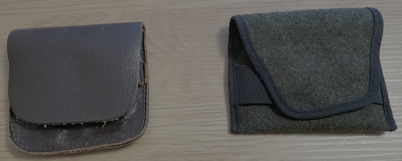 das erste ist aus Leder, das zweite aus dünnem Filz. Beide enthalten je 6 Schlaufen aus Gummi-Zugband. Das Lederetui passt nach meiner Schätzung von der Größe für Patronen des 8x57-Formats; das Filzetui maximal bis 308Win o.ä.