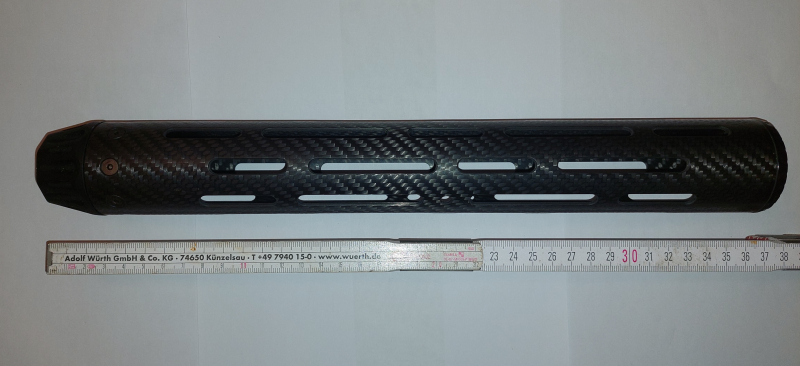 Angeboten wird hier von der Firma Handl Defense ein unbenutzter Handschutz mit leichten Gebrauchsspuren aus Carbon für das Amerikanische Gewehr AR-15 bin mir aber nicht ganz sicher. Länge 37,5 cm, Breite innen Gewinde 3cm, Durchmesser aussen 5 cm. Np lag bei knapp über 300€.