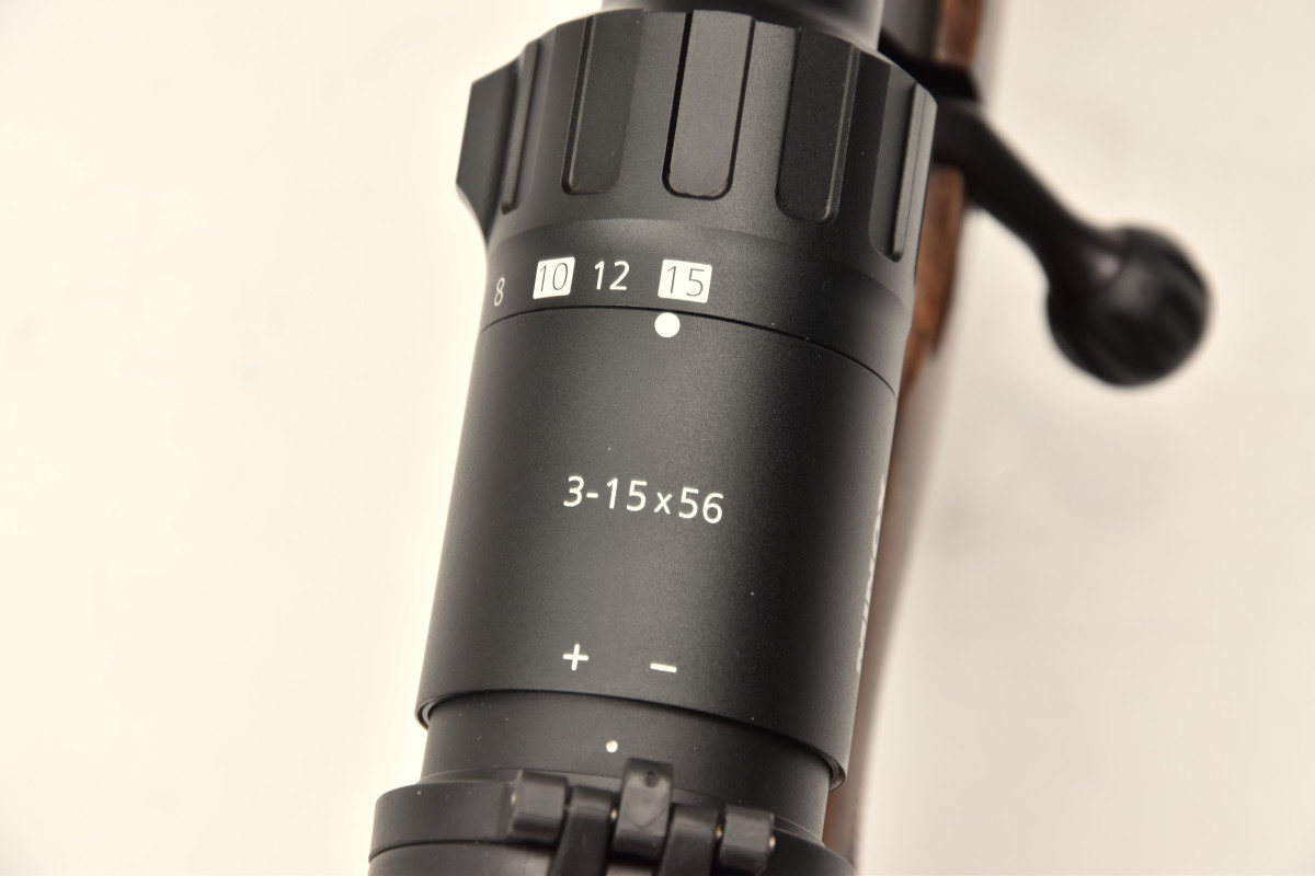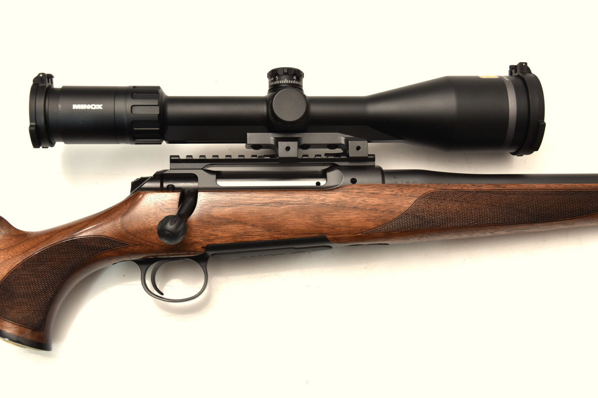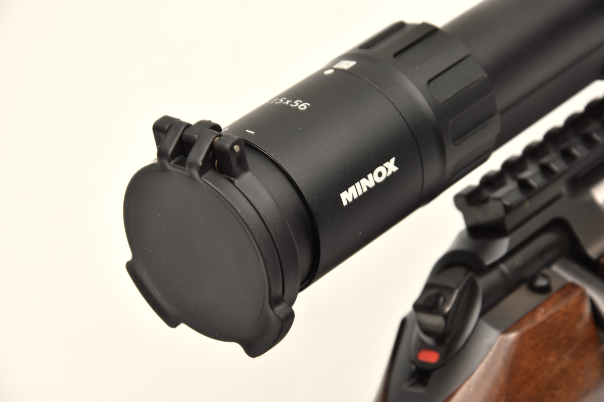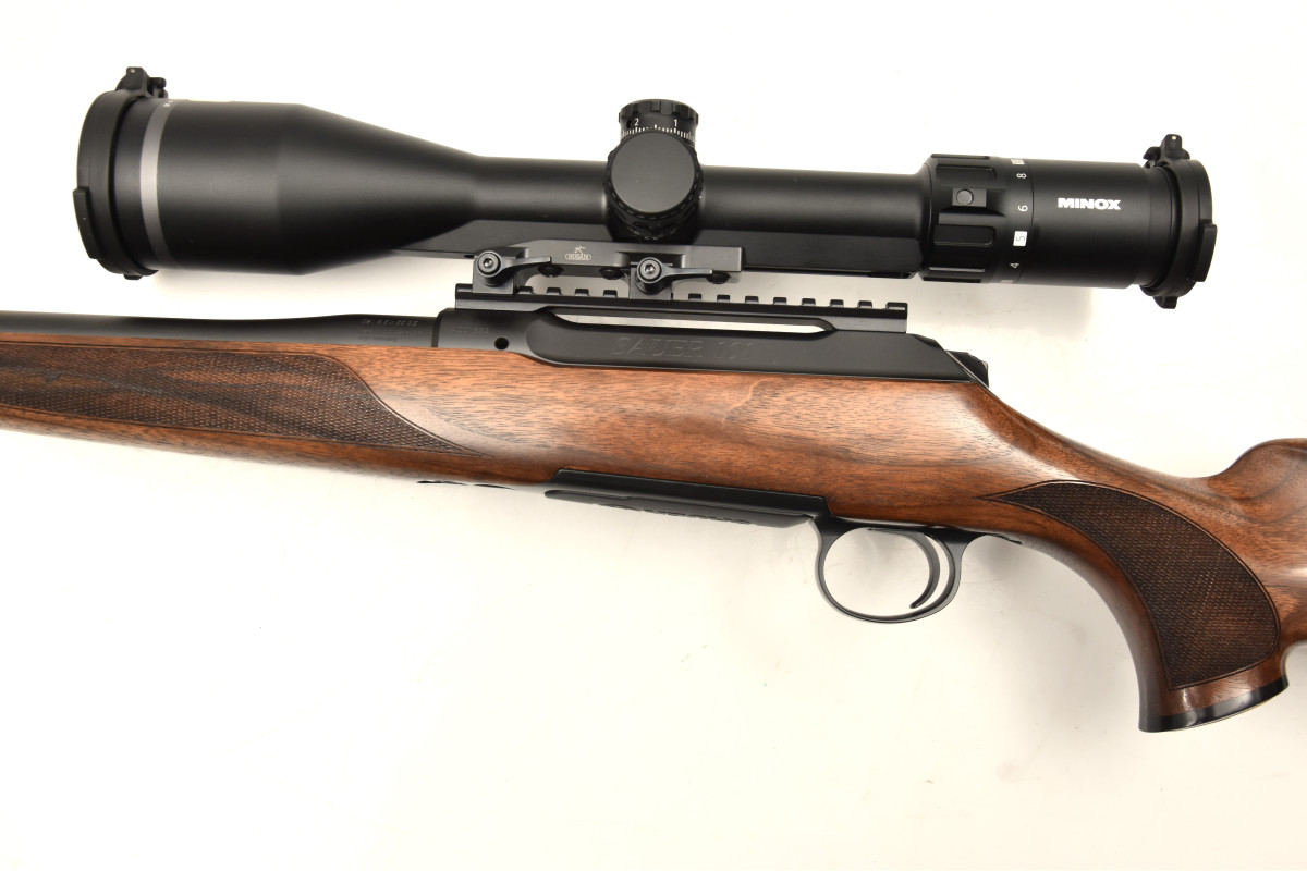 Auf der Waffe befindet sich mittels einteiliger Stahl-Picatinnyschiene ein lichtstarkes variables Zielfernrohr Minox Allrounder 3-15x56 mit Leuchtabsehen 4, FRA (Absehenschnellverstellung) und Zeiss-Innenschiene.