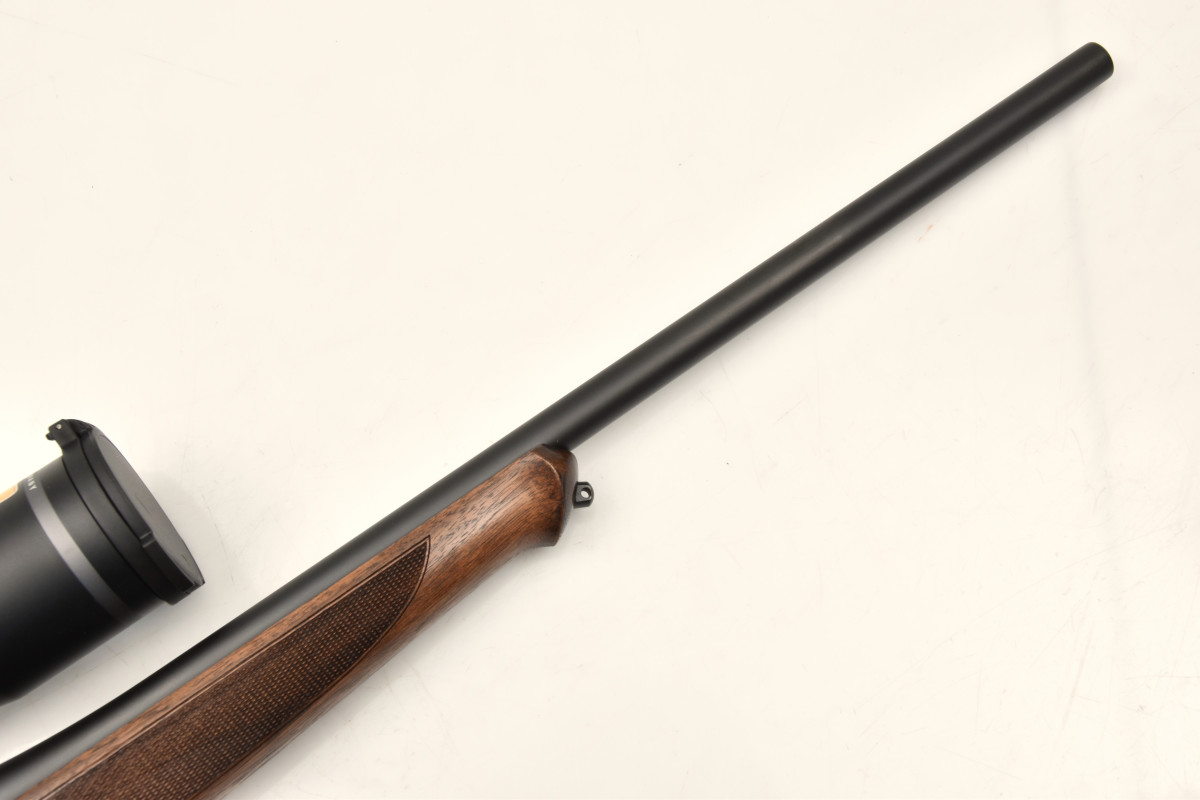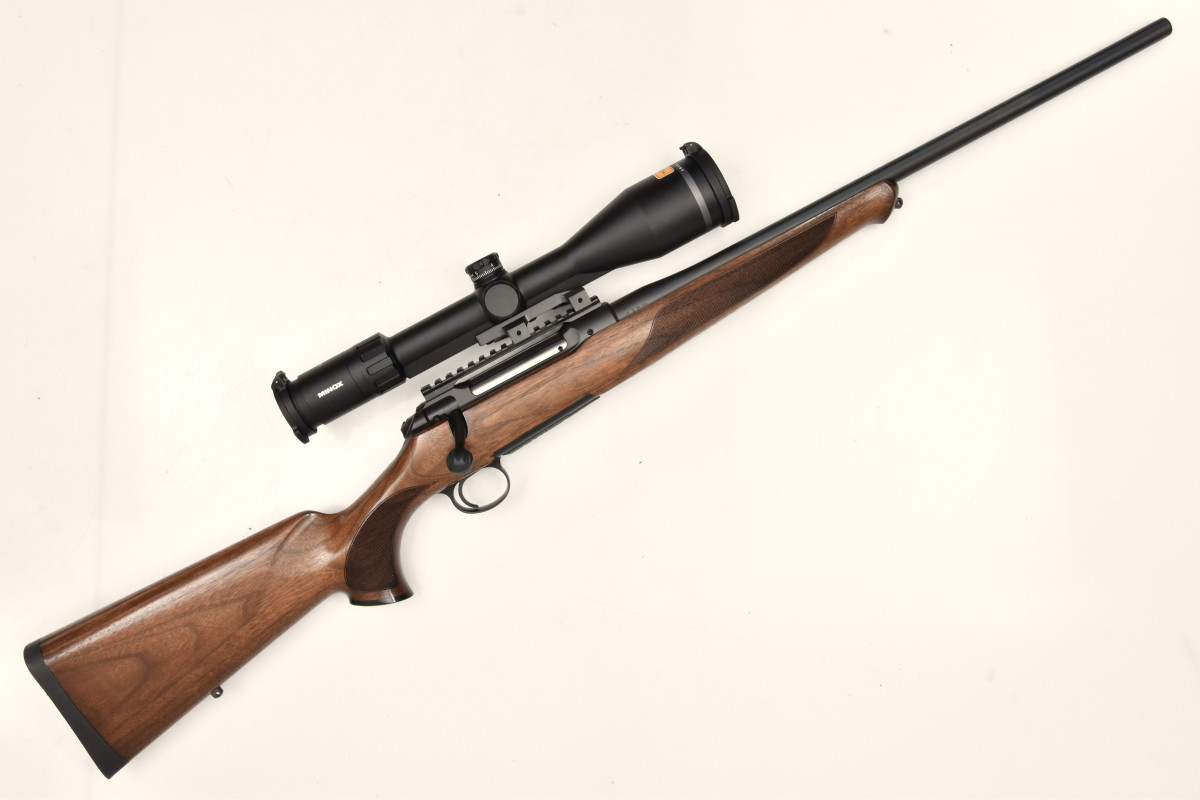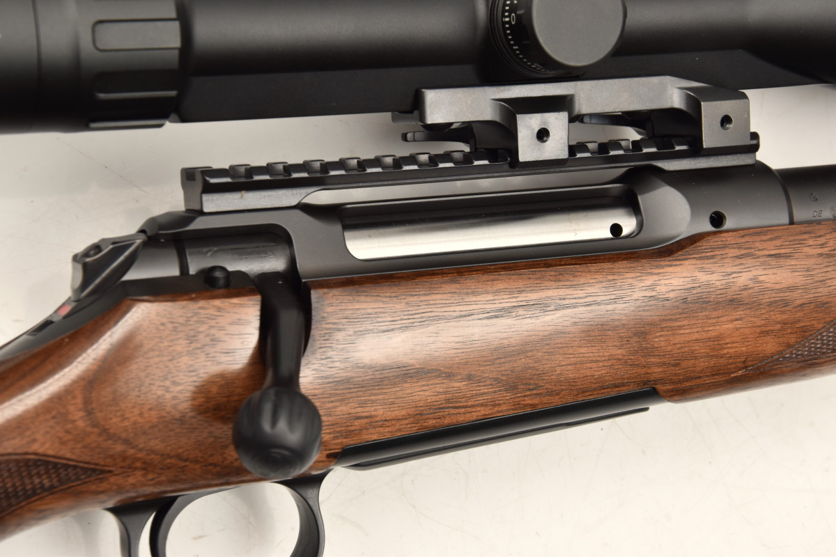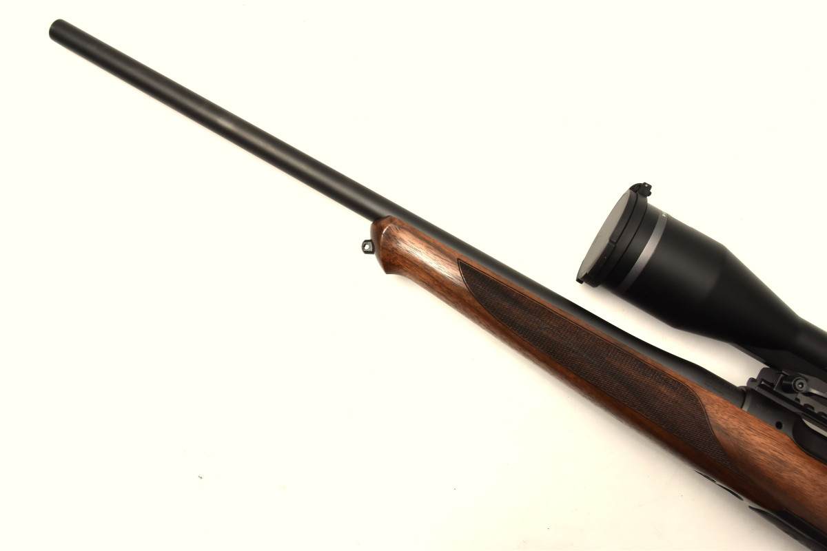 Auf der Waffe befindet sich mittels einteiliger Stahl-Picatinnyschiene ein lichtstarkes variables Zielfernrohr Minox Allrounder 3-15x56 mit Leuchtabsehen 4, FRA (Absehenschnellverstellung) und Zeiss-Innenschiene.