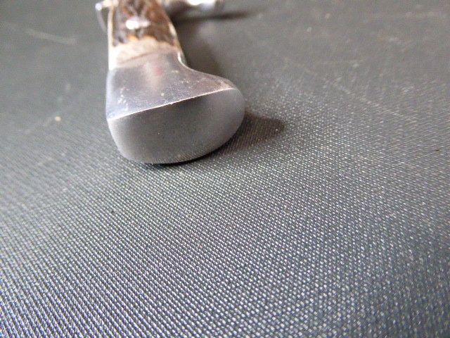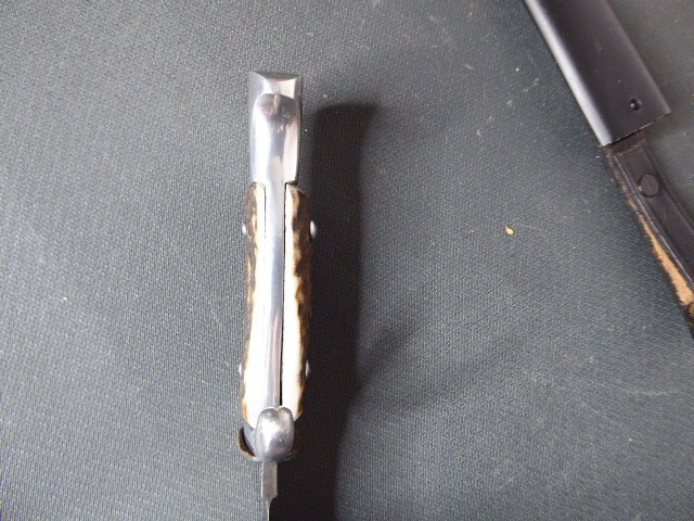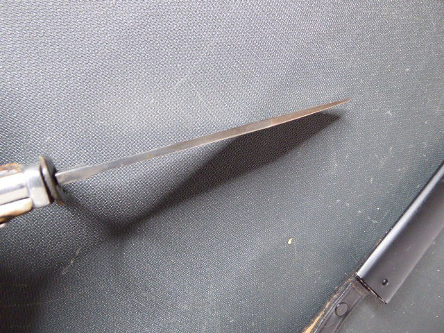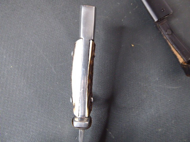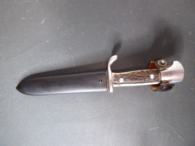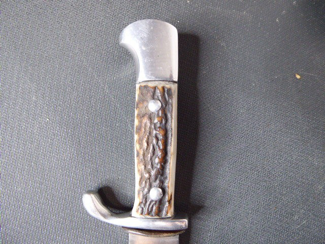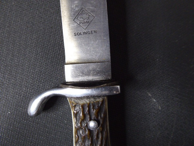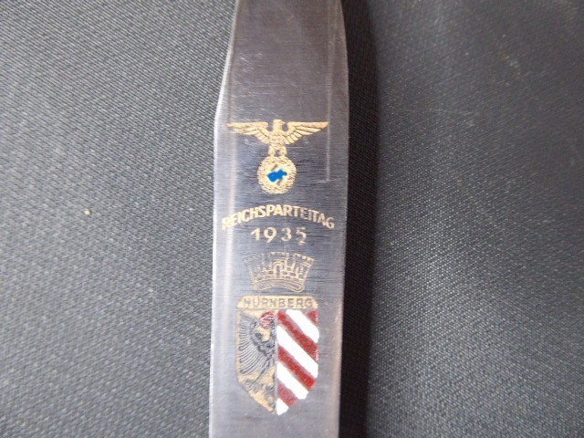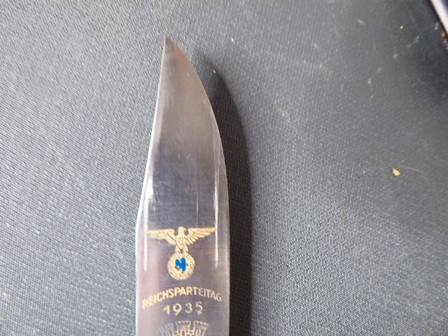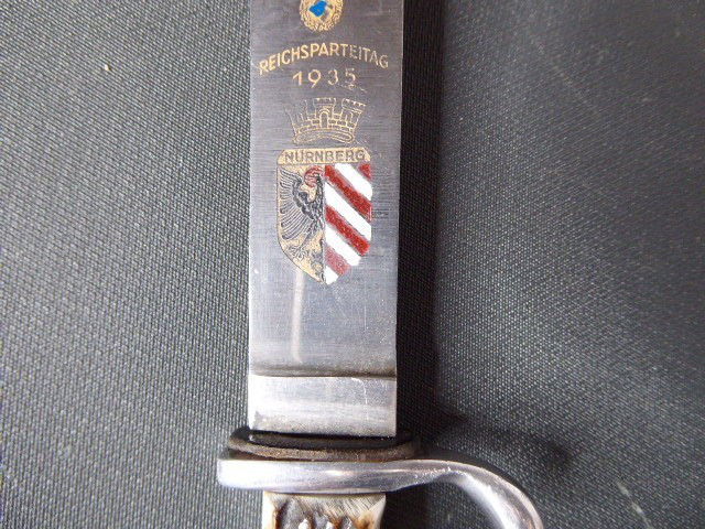 Aus meiner Sammlung gebe ich, einen alten? Seltenen Ehrendolch Reichsparteitag Nürnberg 1935 mit Scheide und Hersteller Puma ab. Kenner werden es sicherlich wissen was das Teil ist. Griff zwei Hirschhornschalen ohne Emblem. Gefäß aus Aluminium. Einschneidige Klinge einseitig mit Hersteller PUMA SOLINGEN, andere Seite mit Inschrift Reichsparteitag 1935 darunter Ader und Nürnberger Wappen in Farbe. Scheide aus Stahl Magnetisch mit Lederner Trageschlaufe. Ob das Teil Zeitgenössig ist kann ich nicht zu 100% sagen, man kann ja fragen wem man möchte, einer sagt Original ein anderer wieder ist nicht aus der Zeit, habe das Stück aber mal als Original erworben, für mich ist es Original. Habe auch sehr viele Aussagekräftige Fotos gemacht, damit nicht wieder danach rumgemosert wird. Also wer Zweifel hat sollte Bitte nicht mitbieten. Das Teil ist im sehr Guten Sammelwürdigen Zustand und sehr Selten. Alles andere entnehmen Sie Bitte den Fotos. Gesamtlänge: 21,2 cm, ohne Scheide: 20,8 cm, Klingenlänge: 12 cm, Klingenbreite: 2,1 - 2,3 cm. Kann zu jederzeit bei mir besichtigt werden. Privatauktion keine Rücknahme und Garantie.