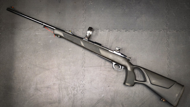 Verbaut sind Suhler Einhakmontageteile, passend für Swarovski Z6i oder Z8i Zielfernrohre mit 56 mm Objektivdurchmesser und Swarovski-Schiene (Zielfernrohr nicht enthalten).