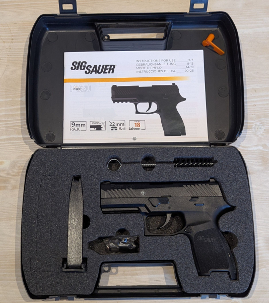 Der Zustand der Schreckschuss Pistole Sig Sauer P320 schwarz Kaliber 9 mm P.A.K., ist wie neu. Ich habe sie bei Sportwaffen Schn. gekauft, und es wurde kein einziger Schuss abgegeben. Sie, und der kleine Waffenschein, haben mich nur auf Spaziergängen in der Natur begleitet. Es ist alles im original Zustand, mit Zubehör, siehe Bilder. Kann auch gerne abgeholt werden.