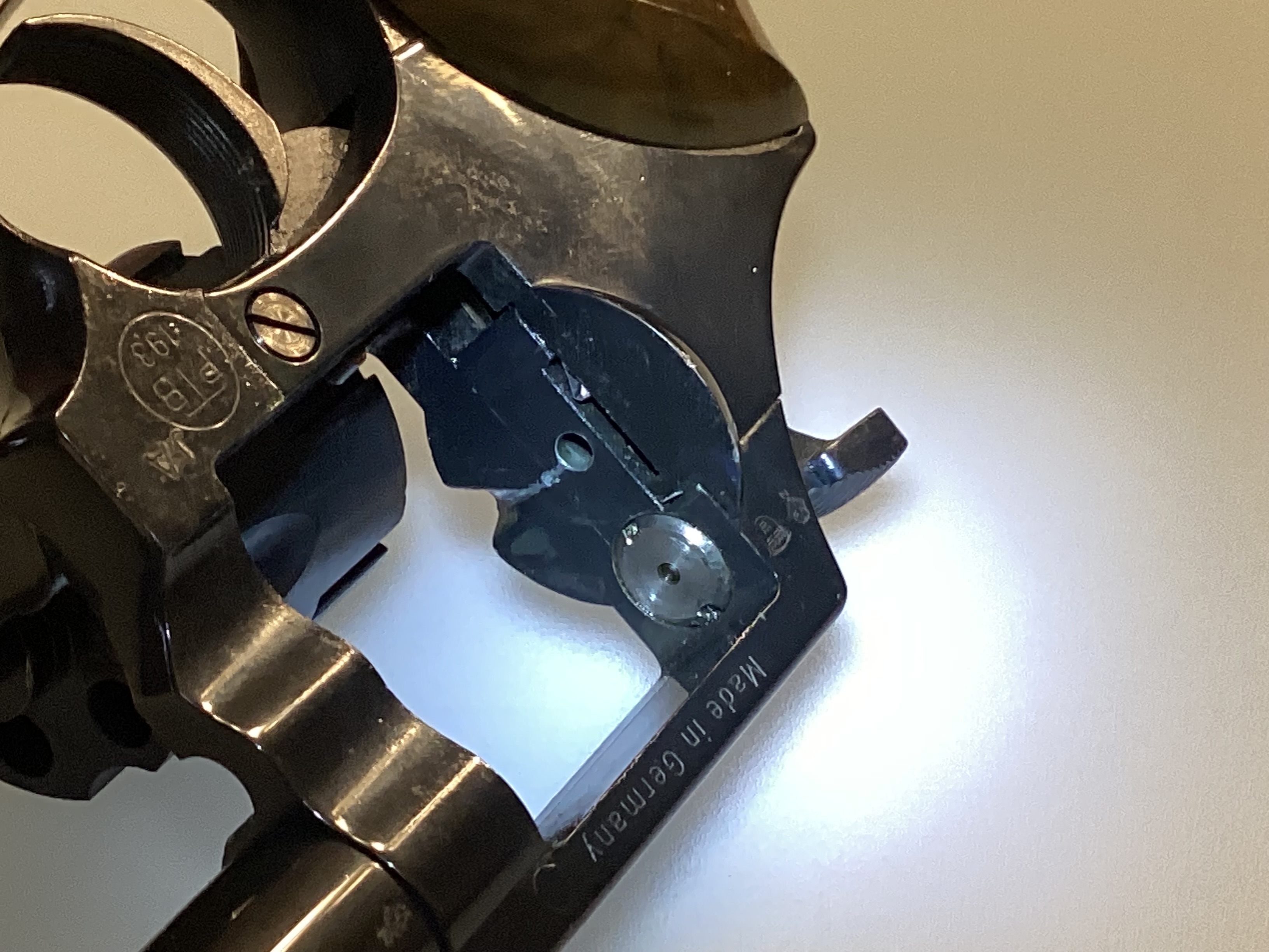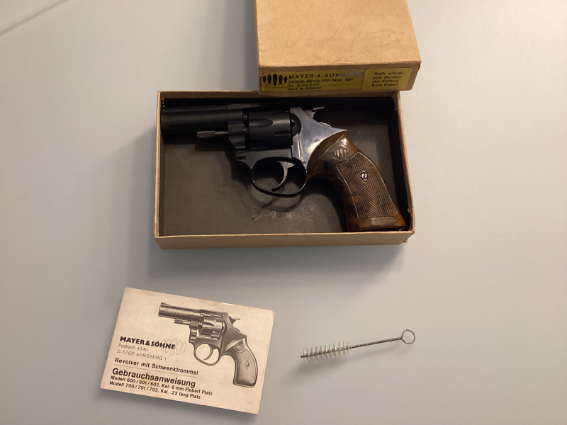 Mayer & Söhne Mod. 700/1, cal. 22 lang Platz Knall, PTB-Nr. 193, absolute Rarität mit Originalschachtel, sehr geringe Schmauch- und Verschleißspuren, Beschussjahr JA (1980), Lauf mit integriertem Abschussbecher, verschießt auch die günstige 6mm Knall-Munition, in diesem Zustand wohl nicht mehr zu finden, Revolver ist voll funktionsfähig, weicher Schlossgang, Griffschalen in einwandfreien Zustand, Originalschachtel zeigt leichte Lagerspuren, originale Putzbürste und Bedienungsanleitung, Versandkosten in das EU-Ausland bitte per Mail erfragen, Abgabe ab 18 Jahre nur gegen Altersnachweis, da es sich um einen Privatverkauf handelt, hier der Hinweis, dass ich keinerlei Gewährleistungs- oder Rücknahmeansprüche gelten lasse. Und nun viel Spass beim Bieten….