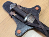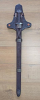 Das Schwert kommt mit einer sehr schönen Holz-Wildlederscheide (dunkel nachgebeizt), einer daran angebrachter Gürtelaufhängung und einer selbstgefertigten lederbezogene Holzplatte in Form eines Thorhammers zur Aufhängung an der Wand.