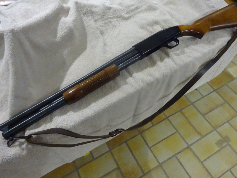 aus Jägernachlass: sehr gut erhaltene Vorderschaftrepetierflinte Mossberg Modell 500 Kal. 12/76,