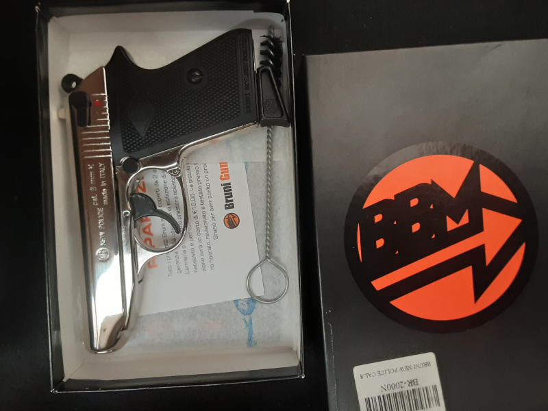 Bruni Selbstlade Pistole New Police 8 in Chrome, Kaliber 8mm PAK, mit CIP N Beschuss in leicht gebrauchtem Zustand. Ich habe damit nicht geschossen. Trockenfunktion ist gegeben. Zum schießen eigentlich nicht geeignet da Top Firing. Eher was für Sammler Italienischer Preciosen.