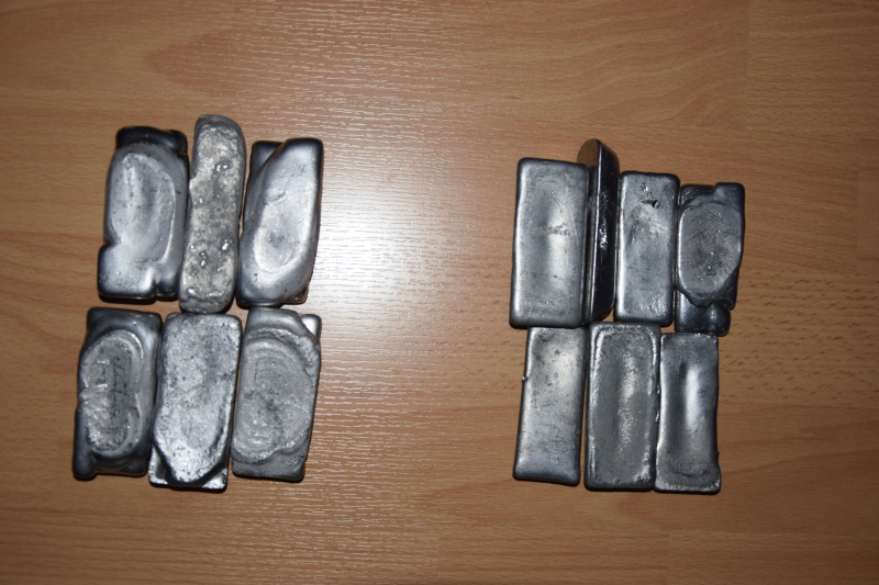 Verkaufe aus Nachlass: ca. 4,5 Kg Geschossblei mit insges. 13 Bleibarren -6 Bleibarren 2,63 Kg Hartblei - 7 Bleibarren ca. 1,85 Kg Legierungsblei. Das Geschossblei ist in handlichen Barren gegossen. Es ist kein Schießstandblei bei dem Hartblei oder "gestreckte" Lettern bei dem Letternmetall/Legierungs-Blei. Aufgrund meines Tests mit dem Härteprüfer von Bischof müßte der Härtegrad bei dem Legierungsblei über 20 Brinellhärte und das Hartblei bei ca. 15-16 Brinellhärte liegen. Gemäß Literatur setzt sich das Letternmetall aus Blei, ca. 5 - 6 % Zinn und ca. 28 - 29 % Antimon zusammen. Die Angaben wurden nach bestem Wissen gemacht, ohne Gewähr für die Richtigkeit. Da es ein Privatverkauf ist, keine Garantie, Gewährleistung, Umtausch oder Rücknahme. Sachmängelhaftung wird ausgeschlossen (muss leider immer angegeben werden). Egun ich, Versandkosten über Hermes -ohne Inseln- zahlt der Käufer. Viel Spaß beim Bieten.