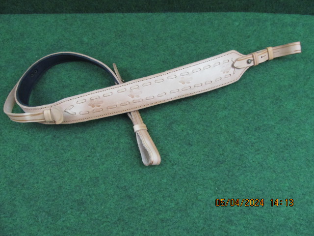 Dieser wunderbar gefertigte Gewehrriemen aus echtem Rindleder hat eine Länge von ca. 104 cm. Der Riemen ist mit schönen Lederarbeiten und Verzierungen geschmückt. Durch die qualitativ sehr hochwertige Verarbeitung ist der Riemen sehr robust und widerstandsfähig. Dies ist keine Stangenwahre, sondern beste Sattlerarbeit. Der Riemen hat über die gesamte Länge auf der Rückseite / Trageseite eine Polsterung sowie eine Antirutsch-Oberfläche zum bequemen und sicheren Tragen. Die Länge des Riemens ist beidseitig um 3 Löcher verstellbar (6,5 cm!!). Die Farbe ist Weiß.