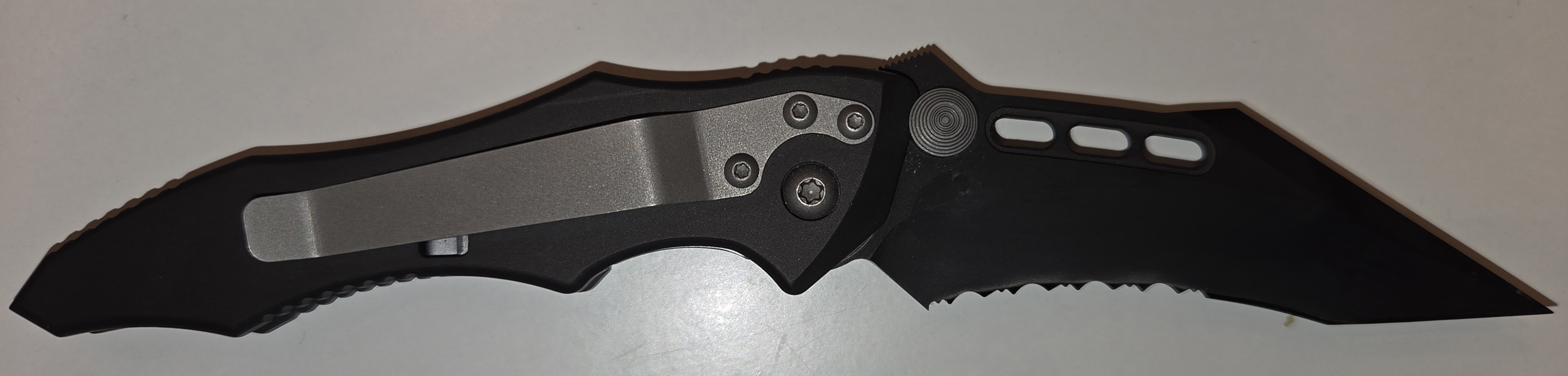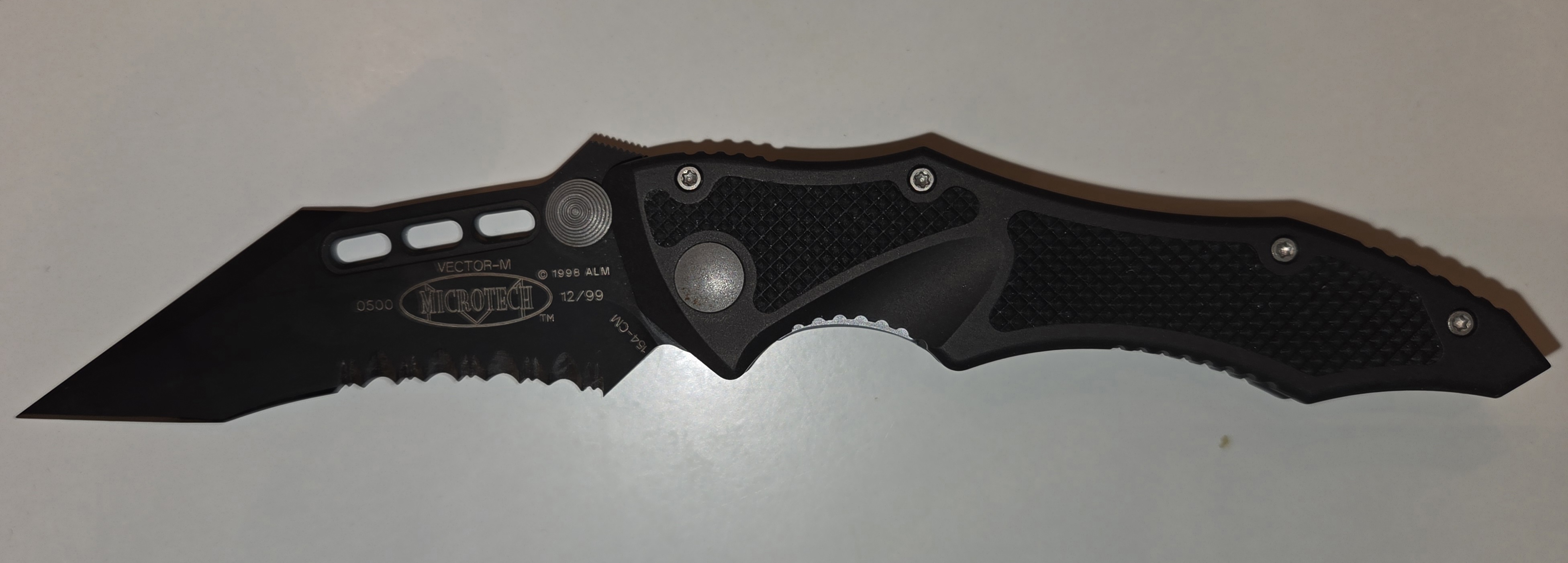VECTOR – Pirela Blade Design. Der Exot unter den Micro Tech-Messern, völlig eigenwillig im Design. Schwarz eloxierter Aluminiumkörper mit Kraton-Einlagen. Titan-Hosen-Clip. Die Titan-Carbon-Nitrid beschichtete Klinge stammt vom dem berühmten Designer Pirela, der diese Form geprägt hat. Das Messer besitzt eine modifizierte Tanto-Klinge, deren Spitze leicht nach unten gebogen ist. Die geschwungene Schneide ermöglicht ein leichtes und sicheres Schneiden. Drei ovale Durchbrüche in der Klinge reduzieren das Gewicht und stellen zudem ein weiteres Design-Element dar. Der schlanke Griff bietet eine Vielzahl an Griffmöglichkeiten und trägt im Alltag nicht auf. Auch dieses Modell ist mit farbig anodisierten Metallröhrchen ausgestattet.