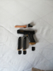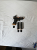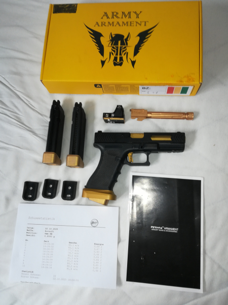 Waffe war nie draußen ,habe nur ein paarmal damit im Keller geschossen. Dazu 2xErsatzmagazine mit Verlängerung (origin. Magazin Böden sind dabei) (Verlängerungen habe ich mit Goldfarbe angem.) ein Outerbarrell mit Gewinde für Silencer oder Tracer usw. Red Dot mit Halterung (der Wechsel geht schnell und einfach, Kimme abschrauben, kpl. Red Dot mit Halterung aufsetzen und festschrauben.