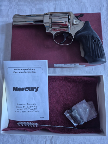 Verkaufe,aus dem Nachlass meines Vaters,diesen Revolver Mercury M2 Thunder cal.9mm Knall. Zustand siehe Bilder,Vitrenenstück,sieht unbenutzt aus.Mit orig.Verpackung,Beschreibung,Bürste und Abschußbecher. Da von privat,keine Garantie oder Rücknahme.