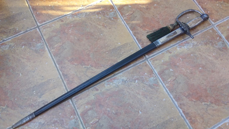Rustikaler Jagddegen/Jagdplaute, Gesamtlänge ca. 88 cm, Beschläge, Gefäß und Klinge fleckig, teilweise beschliffen. Provenienz nicht bekannt, Fund aus Haushaltsauflösung/Nachlass. Privatverkauf, keinerlei Gewährleistungs-bzw. Garantierechte. Auslandsversandkosten bitte erfragen.