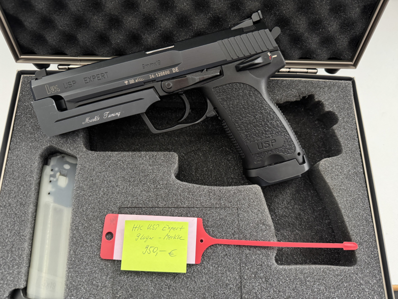 Pistole Heckler&Koch Mod. USP Expert, Kal. 9mm Luger, mit Merkle Laufgewicht, Koffer, Ersatzmagazin. Bestzustand. Versand nur innerhalb DE per Kurierzustellung. Ausländische Bieter müssen deutschen Exporthändler benennen. EWB erforderlich. Kommissionsverkauf. Keine Garantie, keine Rücknahme, kein Umtausch.