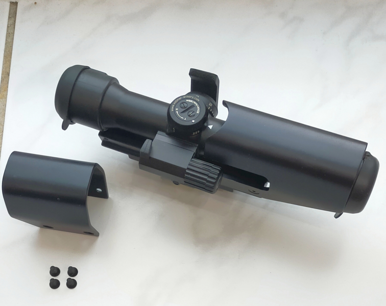 Stanag Montage. Es gibt aber mittlerweile Adapter auf Picatinnyschiene. Strichplattenbeleuchtung ist neu und macht ein perfektes Bild. Helligkeit stufenlos regelbar. Linsen ohne Kratzer. Gehäuse ebenso. Es wurde ein passgenauer 2 -teiliger Schutz aus Aluminium für das Zielfernrohr angefertigt, fachmännisch beschichtet und verschraubt. Somit ist das Glas gegen jegliche Stösse geschützt. Der Schutz lässt sich natürlich auch wieder entfernen. Eine Inbusschraube ist leider ausgeleiert. Inklusive Gummikappen und einen original Köcher in Flecktarn.