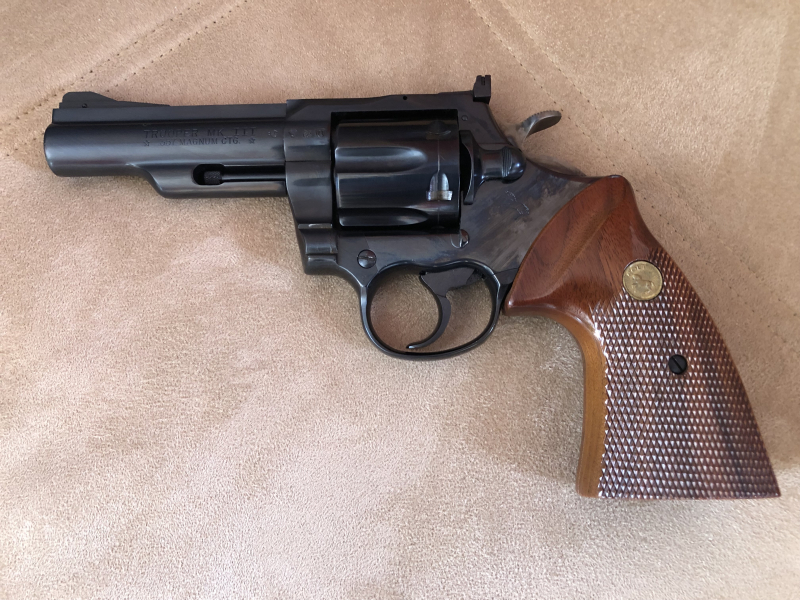 Revolver Colt Trooper MK III, Kal. .357Magnum, 4 Zoll Lauflänge, neuwertiger Zustand, frühe Fertigung (Beschuss 1977). EWB erforderlich. Kommissionsverkauf. Keine Garantie, keine Rücknahme, kein Umtausch. Versand nur innerhalb DE. Ausländische Bieter müssen deutschen Händler für den Export benennen.
