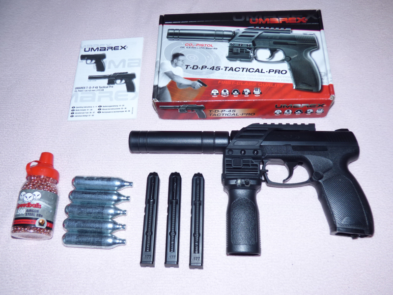 Angeboten wird die Pistole auf den Fotos: Umarex T.D.P.45 CO2 Pistole für cal 4,5 mm Stahlkugeln in der Tactical Pro Version. Diese Version hat (gegenüber der Standard TDP 45) zusätzlich eine Brückenmontage z.B. für optisches Zubehör wie Red Dot, eine Schalldämpfer- und Laserattrappe.