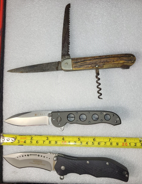 Biete hier ein kleines Konvolut alter Messer an – teils älter, teils sammelwürdig. In der Mitte ein unbenutzes neuwertiges CRKT M21-02 mit toller Klingensicherung.