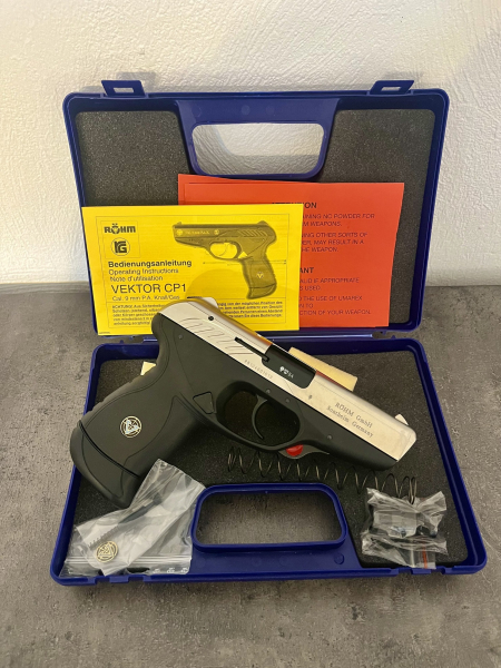 Zum Verkauf steht eine hochwertige Röhm Vektor CP1 im Kaliber 9 mm P.A.K., ausgestattet mit einem vernickelten Schlitten aus originaler Röhm-Produktion – ein echtes Highlight für Sammler und Liebhaber!