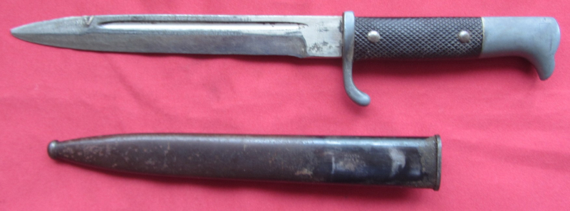 Biete hier dieses deutsche Ausgehbajonett aus der Zeit des WK II - inklusive Scheide – zum Kauf an. Das Metall des Griffstückes ist abgerieben, die Griffschalen sind in einem guten Zustand. Der Drücker ist nur „angedeutet“, hat offenbar keine Funktion.