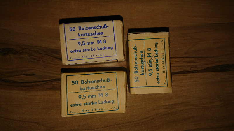 Sie bieten hier auf 150 Stück M8 (extra starke Ladung) Bolzenschusskartuschen VEB Silberhütte Freiberg. Sie wurden verwendet für den DDR Dübelsetzer/Bolzenschussgerät aus Suhl. Die Kartuschen passen bei manch einem alten Schreckschussrevolver (RG89) was NICHT zu empfehlen ist, da die Ladung zu stark für den Zinkdruckguss ist und die SSW explodieren kann... War jahrelang trocken gelagert und funktioniert!