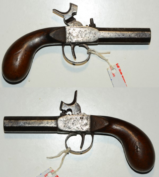 Perkussionsterzerol, Lauflänge 6,2 cm, Gesamtlänge 17,4 cm, Kaliber 12 mm, Metall mit Rostspuren, die Funktion ist gut, der Hahnform nach aus Frankreich, kein Beschussstempel