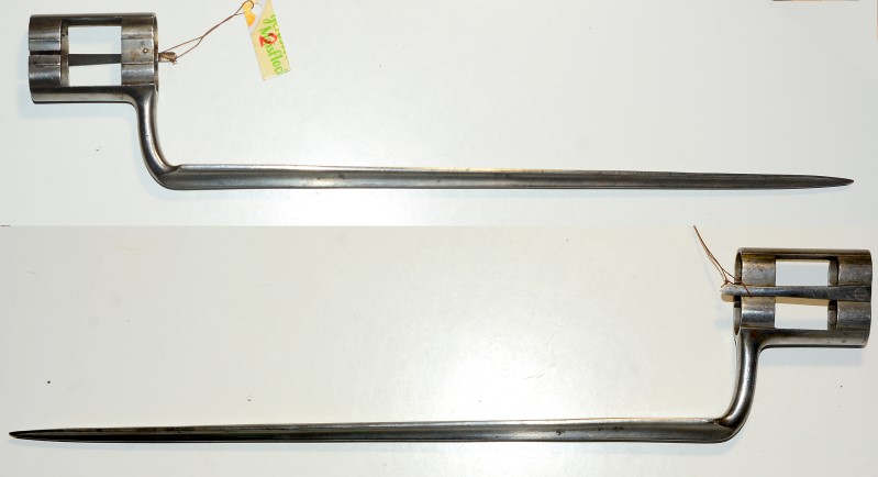 Tüllenbajonett für Doppellaufgewehr, Klinge markiert "IL", Klingenlänge 37 cm, Auf der Tülle Hilfskorn, für Lauf-Außendurchmesser 20,5 mm, Abstand der beiden Lauf-Außenkanten 40 mm, sehr guter Zustand mit minimalen Altersspuren