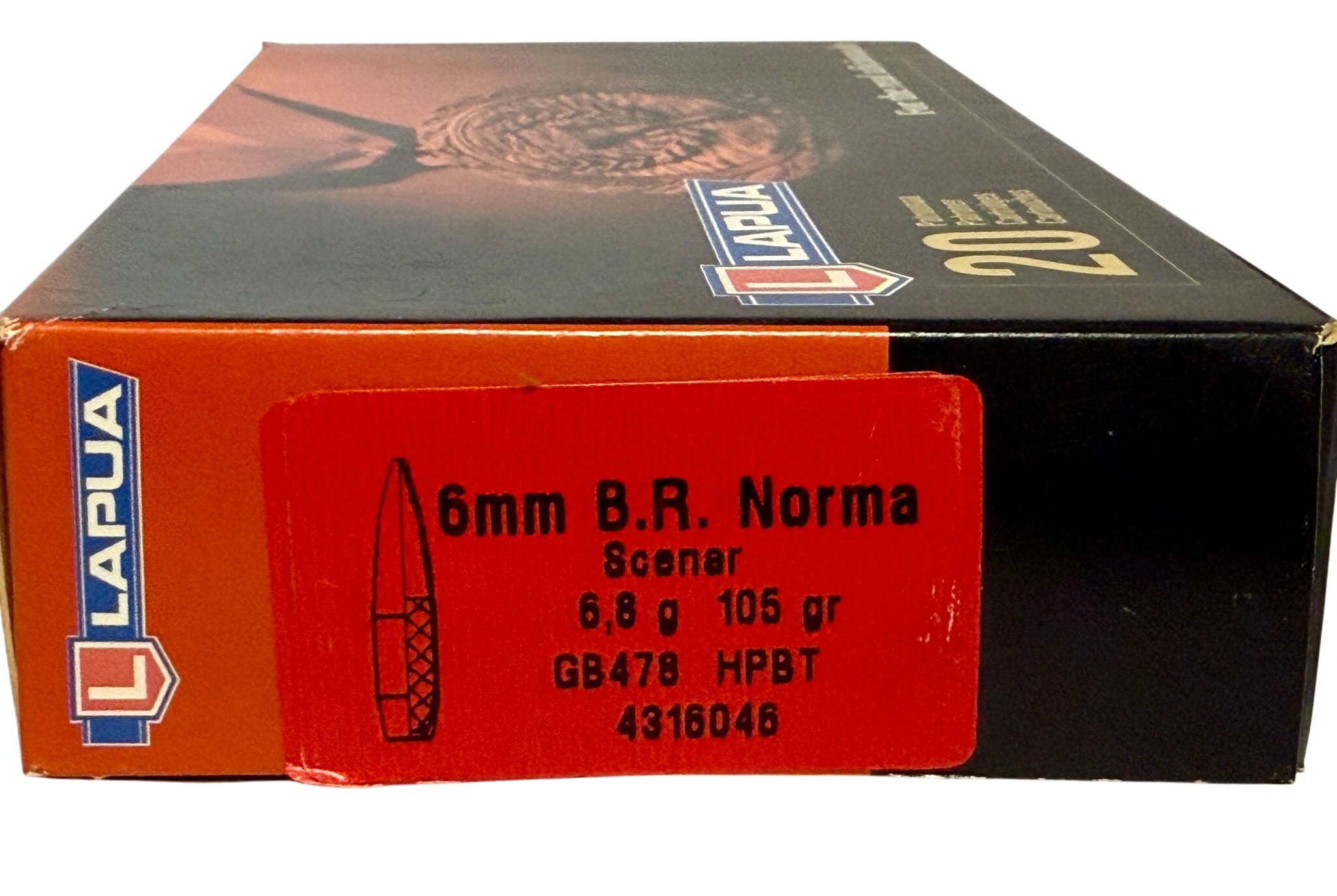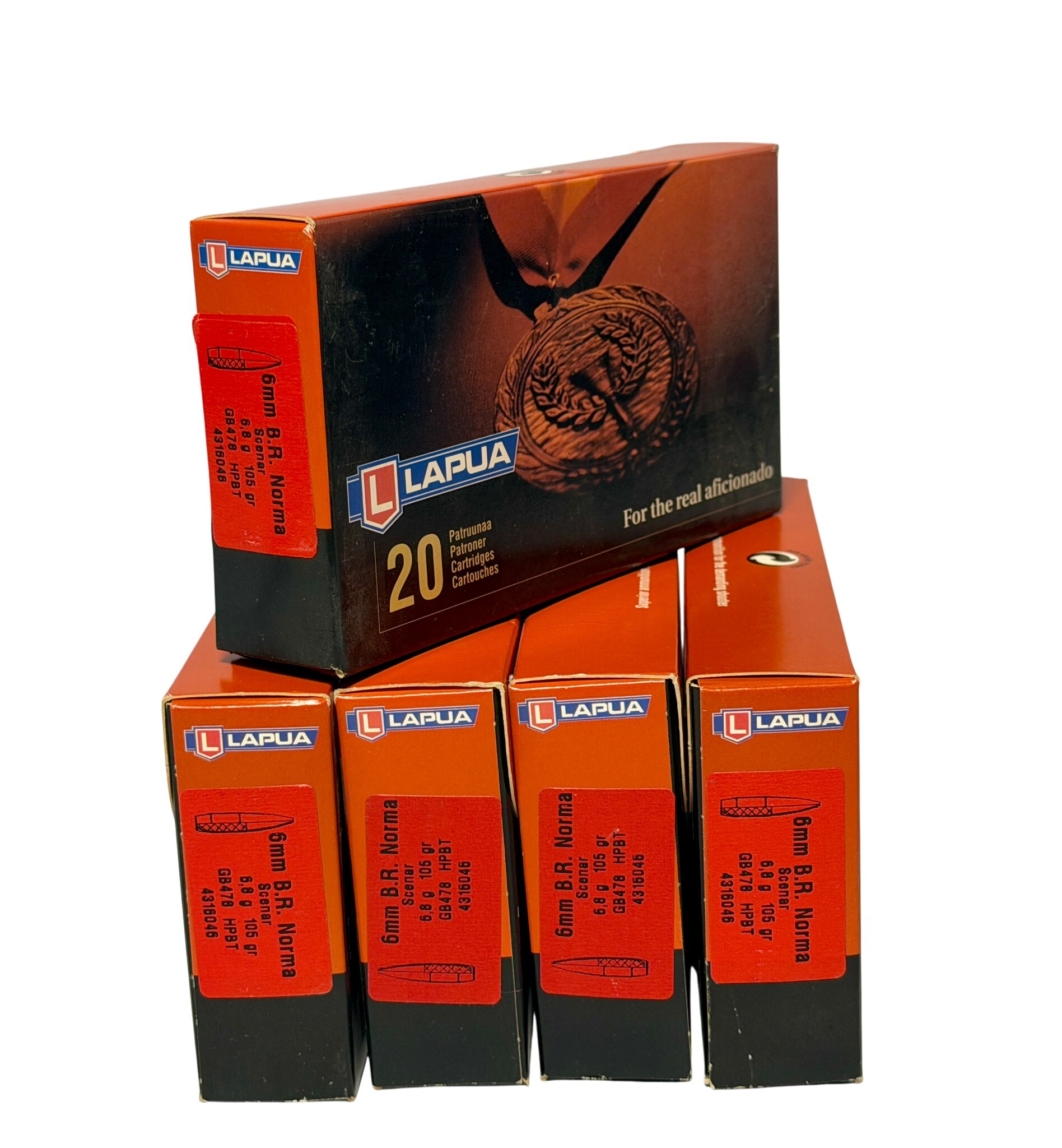 Biete hier für einen Jagdfreund 5 Packen á 20 Schuss (ingesamt 100 Schuss) Munition der Firma Lapua, im Kaliber 6mm B.R., mit Scenar 6,8gramm 105gr. HPBT Geschoss an. Die Munition ist ungeöffnet und wurde kühl und Trocken gelagert.