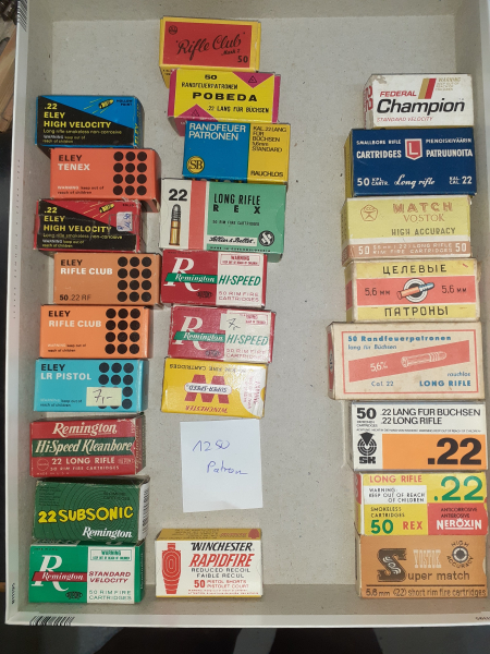 Hier geht es um die abgebildeten 24 vollen Schachteln im Kaliber .22 lfB und kurz.